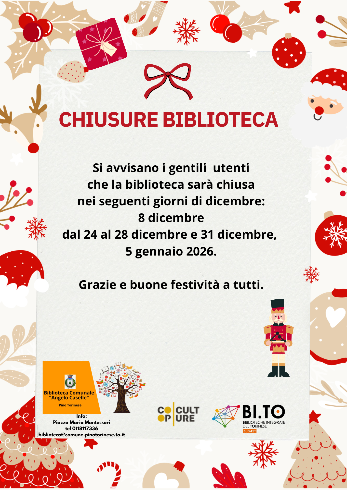 Lo Sportello di Pino Torinese (Villa Grazia) sarà chiuso dal 22 dicembre 2024 compreso. L'attività riprenderà da venerdì 10 gennaio 2025, nei consueti orari di sportello (ore 9:00-12:00).