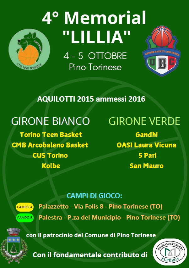 Sabato 4 e domenica 5 ottobre, presso il Palazzetto (Via Folis 8) e la Palestra in piazza del Municipio, si svolgerà il 4° Memorial "Lillia", il torneo di basket che vedrà protagoniste le squadre Torino Teen Basket Pino Torinese, CMB Arcobaleno Basket, CUS Torino e Kolbe (GIRONE BIANCO) e Gandhi, OASI Laura Vicuna, 5 Pari E San Mauro (GIRONE VERDE).