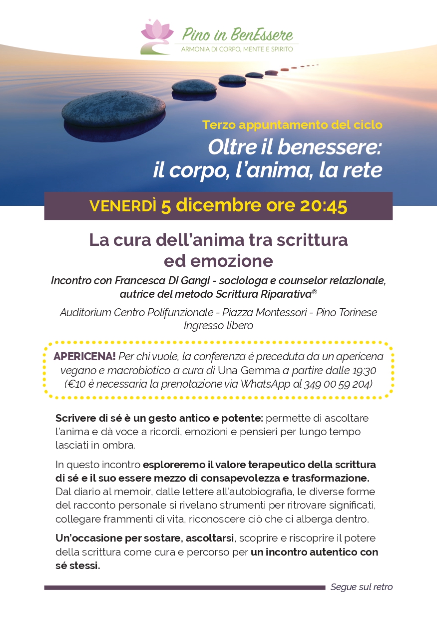 Nell’ambito dell’evento Pino in Ben-Essere 2025, l’Associazione Tempo Reale APS propone un ciclo speciale di tre conferenze gratuite a Pino Torinese, per coltivare una cultura del benessere a 360 gradi. Con il contributo e il patrocinio del Comune di Pino Torinese, il patrocinio di Regione Piemonte e Città Metropolitana di Torino.