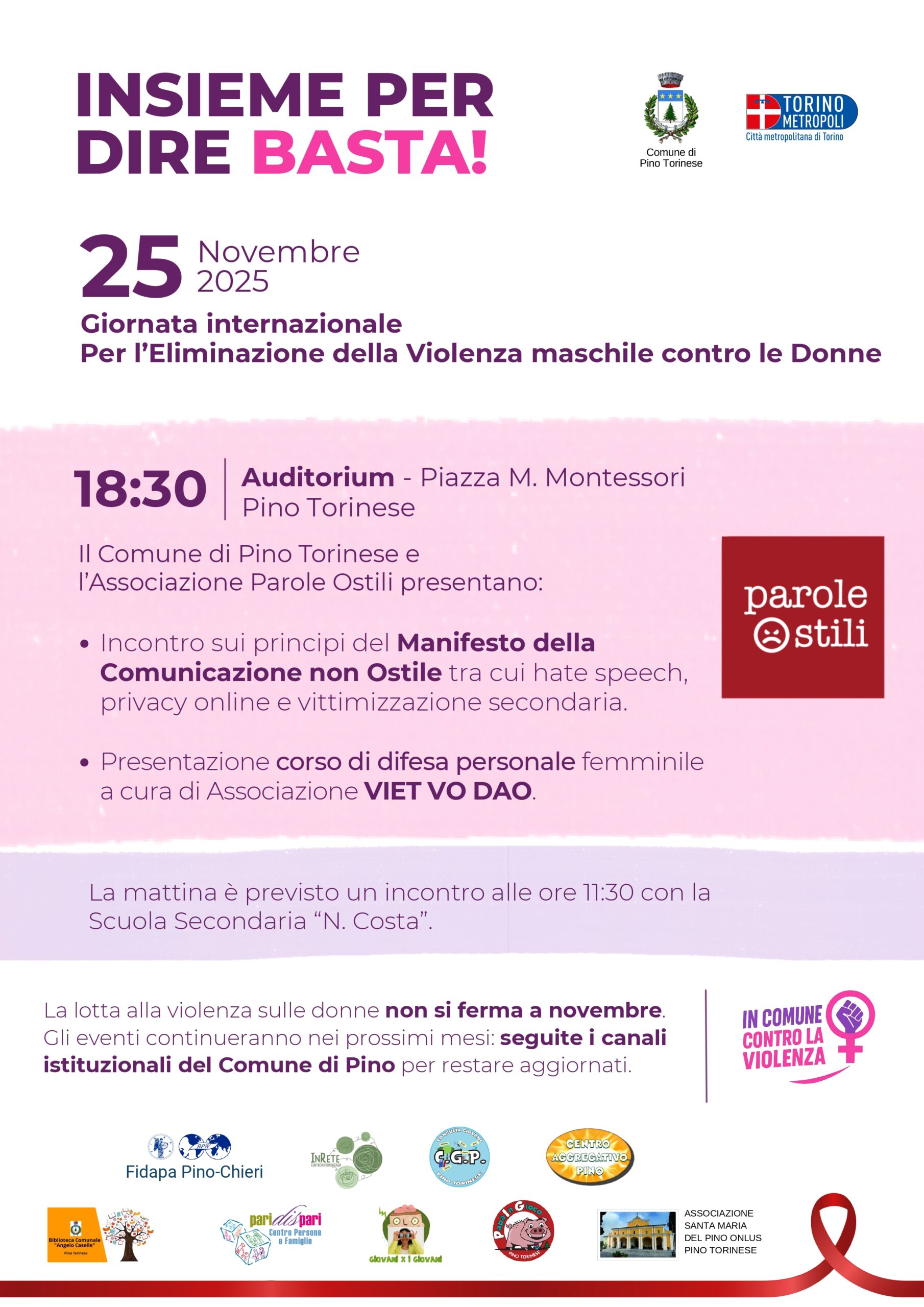 Per la Giornata internazionale per l’eliminazione della violenza contro le donne, martedì 25 novembre alle ore 18:30, presso l'Auditorium di Piazza Montessori, si terrà l'incontro pubblico sul "Manifesto della Comunicazione non ostile" a cura dell'Associazione Parole O-Stili.