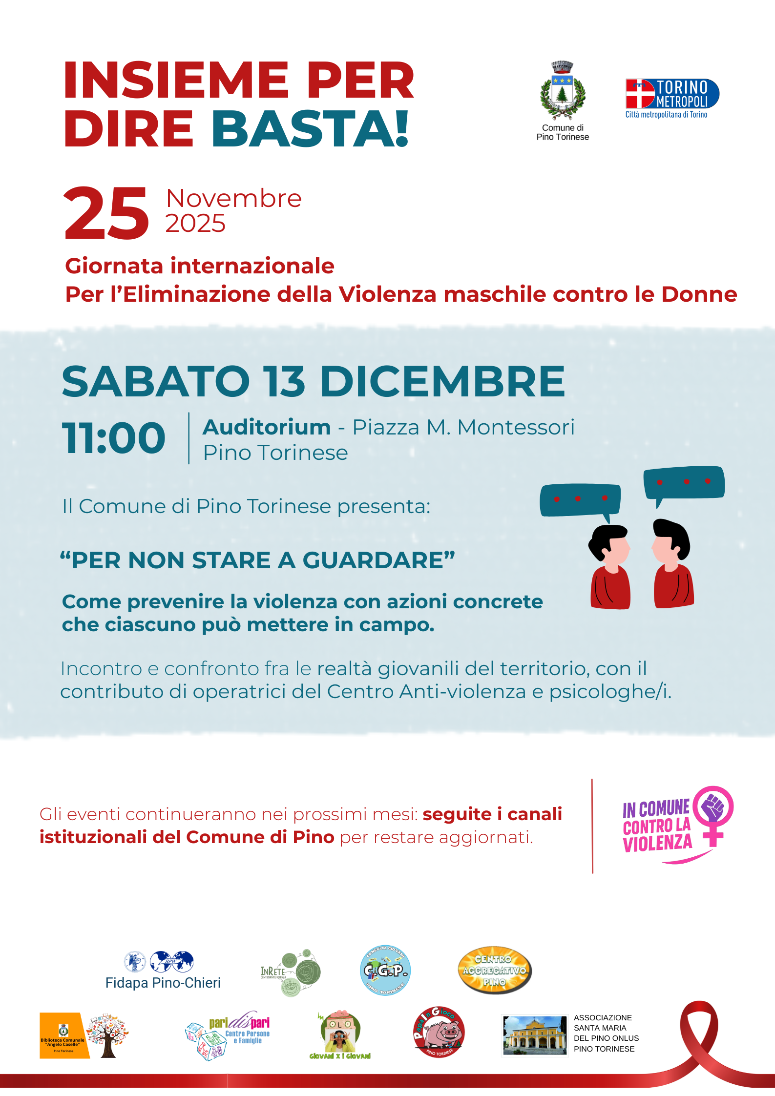 Nell'ambito delle iniziative per la Giornata internazionale per l’eliminazione della violenza contro le donne, sabato 13 dicembre, presso l’Auditorium di Piazza Montessori, l'evento "Per non stare a guardare".