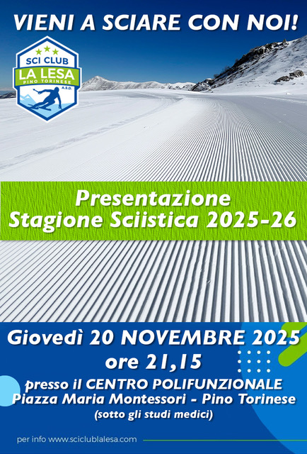 Lo Sci Club La Lesa si prepara a inaugurare la stagione sciistica 2025-2026 con una serata di presentazione in programma giovedì 20 novembre alle ore 21:30 presso il Centro Polifunzionale di Piazza Montessori.