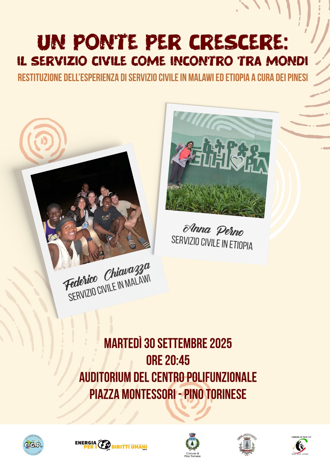 Martedì 30 settembre, in Auditorium, l'incontro di restituzione dell'esperienza di Servizio Civile in Malawi e in Etiopia a cura dei pinesi Anna Perno e Federico Chiavazza.