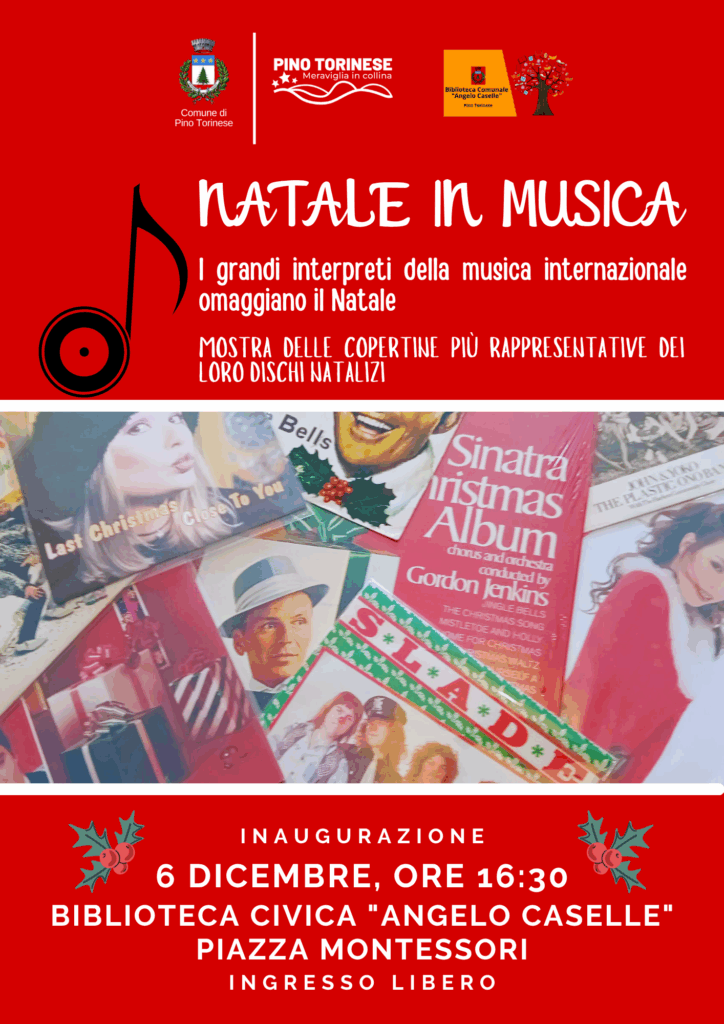 Sabato 6 dicembre alle ore 16:30 verrà inaugurata la mostra “Natale in Musica”, un percorso espositivo dedicato alle copertine più iconiche dei vinili natalizi dei grandi interpreti della musica internazionale. L’esposizione raccoglie alcune tra le immagini più rappresentative degli album che hanno fatto la storia delle festività - da Frank Sinatra a John Lennon e Yoko Ono - offrendo un viaggio nella memoria collettiva e nella tradizione musicale del periodo natalizio. La collezione è messa a disposizione dal cittadino pinese Dionigi Bertot, che ha curato l’esposizione. Ingresso libero negli orari di apertura della biblioteca, fino al 20 dicembre (lunedì, martedì, mercoledì: 14.00 – 18.30; giovedì, venerdì e sabato: 09:00 - 12:00 e 14:00 - 18:30).